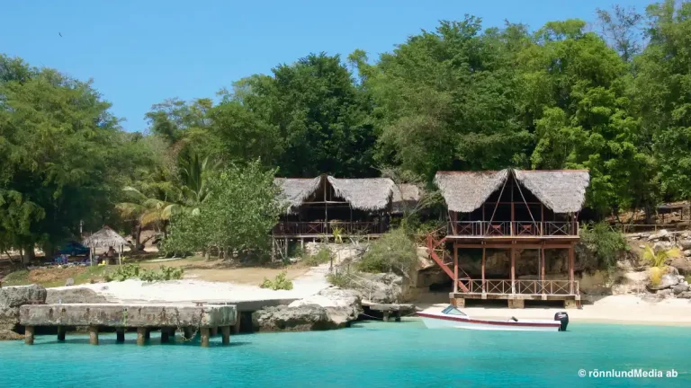 På västra änden av Flores ligger staden Labuan Bajo, en utgångspunkt för många dykarexpeditioner, men också för resor till Komodo Nationalpark, där världens största ödla Komodovaranen håller till. Mellan Komodo och Labuan Bajo ligger en rad små öar, och en av dem heter ”Angel Island”, och där ska vi bo i en eco resort. Ön är så liten att resorten med sina byggnader är den enda anläggningen där.