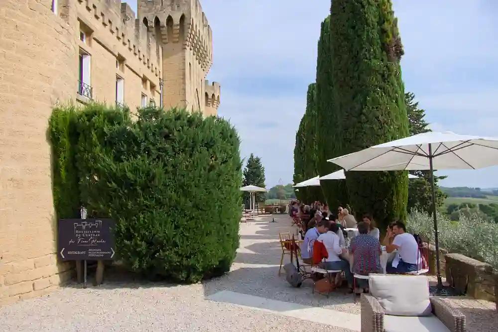 Vi äter en god middag på slottet, typiskt nog med fisk till huvudrätt, så det blir inget av det goda röda vinet här. Men vi köper med oss några flaskor för ta med oss hem till Sverige. Enligt den man som presenterar vinerna vid avsmakningen kan man lagra Chateauneuf-de-Pape-vin i mellan 5 och 15 år, då blir smaken optimal.