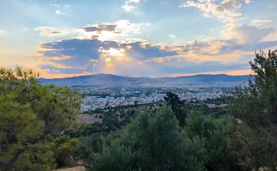 Aten är en stad mellan skogklädda kullar, lätta att ta sig upp på för att hänföras av utsikten. Vår absoluta favorit är Filopappos kulle där ljuset är väldigt speciellt. Den ligger mitt i staden, med härliga omgivningar att flanera sig fram igenom. Den kallas ibland ”musernas kulle”, eftersom man i antiken ansåg att muserna, sångens, musikens och poesins gudinnor samlades där. Det kan vi absolut tro på.