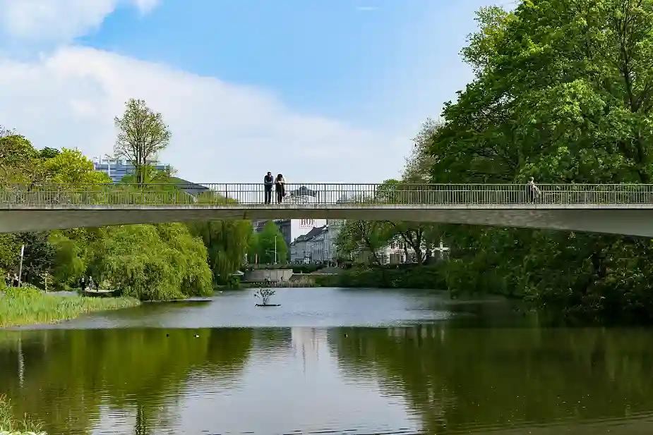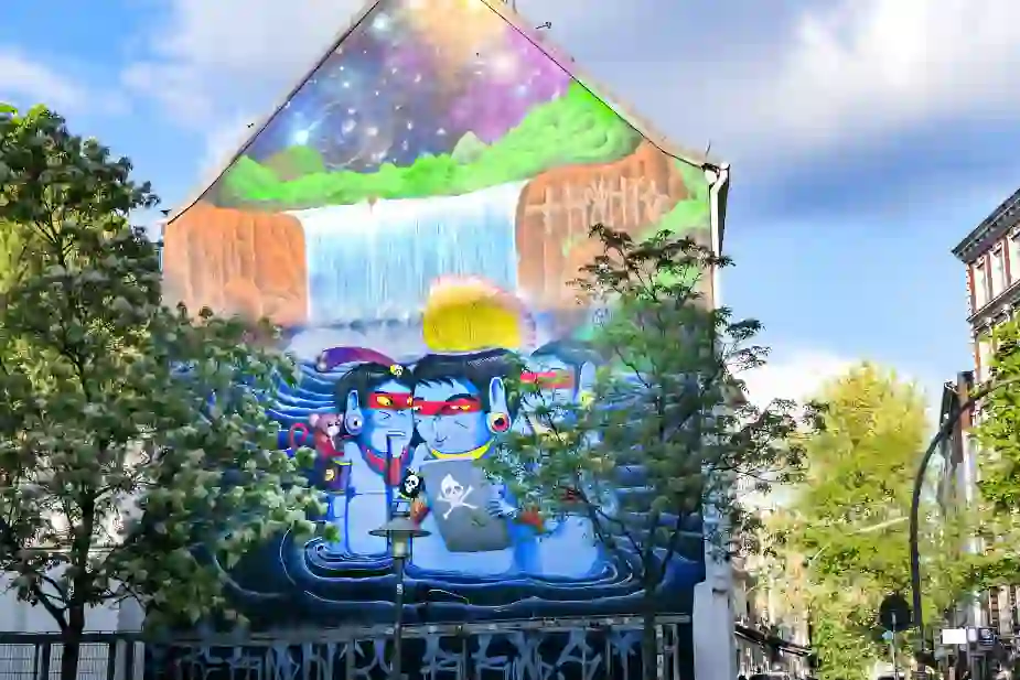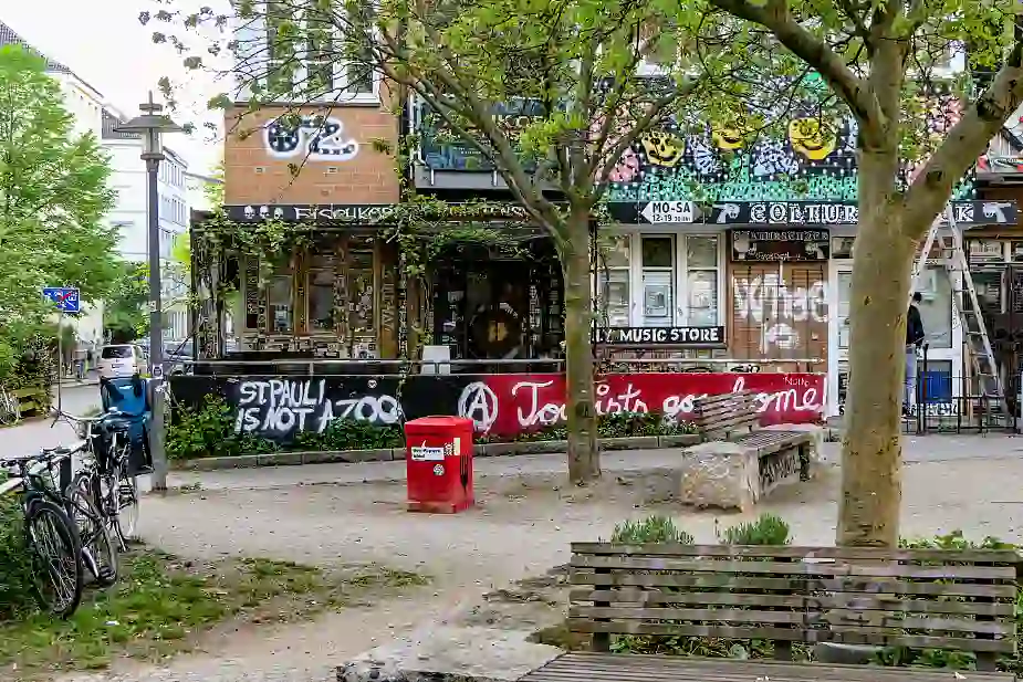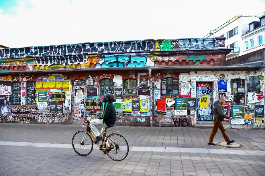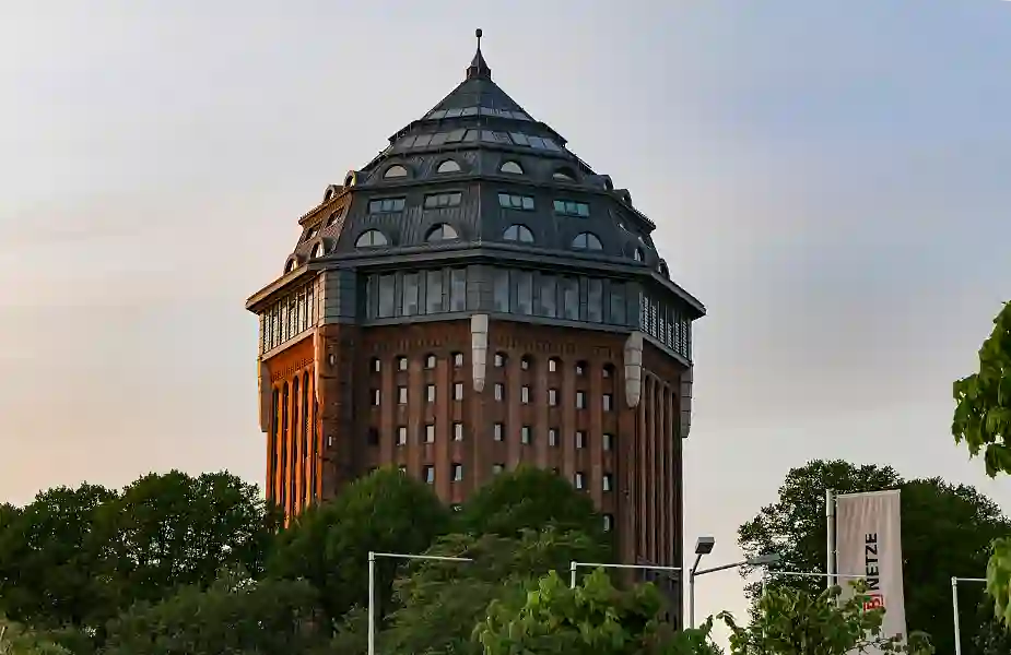 I bakgrunden skjuter den imponerande och rymdskeppsliknande profilen av det gamla vattentornet i Schantzenpark upp. Tornet är numera ombyggt till lyxhotell.
