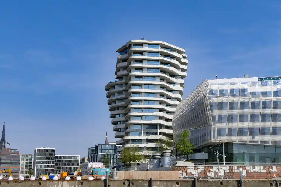Närmast Elbe ser vi de nya gräddhyllorna som tävlar i spejsad arkitektur. I ett av husen, Marco Polo Tower (nedan) finns idag vad som sägs vara Hamburgs i särklass dyraste lägenheter. Motsvarande 40 miljoner kronor kostade en paradlägenhet här för tio år sedan…