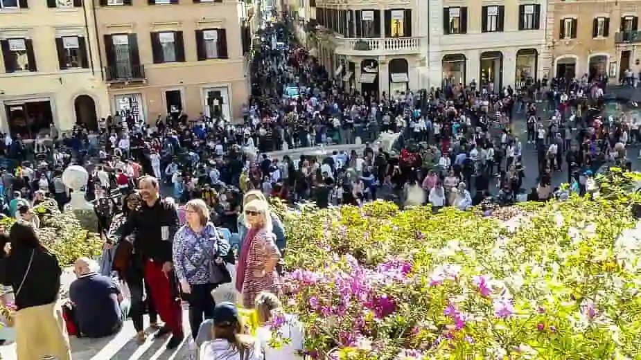 Vi fortsätter ner längs shoppinggatan Via del Corso, som framåt eftermiddagen helt tas över av fotgängare, bilister passerar endast med svårighet. Vi tar till vänster och hamnar på Piazza di Spagna som domineras av Spanska Trappan längs östra kanten. Här är folkvimlet så tätt att det nästan är svårt att ta sig förbi, på själva trappan kryssar man både uppåt och neråt mellan alla som bara sitter där och hänger. Något år senare blir det förbjudet att sitta i trappan.