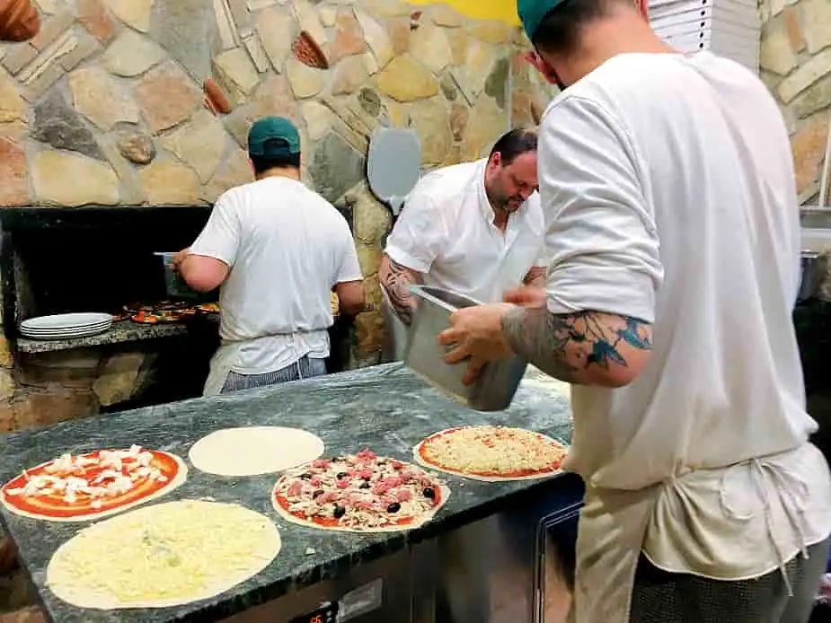 I hjärtat av Trastevere hittar vi trattorian/pizzerian ”Ivos”, där vi bokat bord men på något sätt ändå misslyckats med detta. Vi får stå och vänta i den kombinerade hallen/köket medan irritationen stiger. Vi blir arga, servitrisen blir arg på oss, men plötsligt är det bara leenden och vi leds iväg genom rum efter rum smockfulla av gäster med yviga gester och hög ljudnivå. Längst in finns ett litet bord för oss, vi beställer pizza och in kommer två av de godaste pizzor vi nånsin ätit. Om något är Roms hjärta så är det detta!