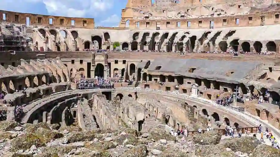 Colosseum är ”granne” med Forum Romanum och köerna utanför är långa. Men tack vare vårt magiska turistkort kommer vi in nästan genast. Det inre av arenan är i sämre skick än vi trodde, men dess storlek är imponerande, liksom de blottade utrymmena under själva planen och gångarna för att leda publiken till rätt plats. Ganska likt Scandinavium i Göteborg, faktiskt…
