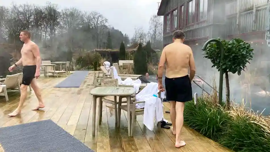 När vi är där är det nära noll och snöflingor yr i luften, men besökarna är ändå lika mycket utomhus som inomhus. Stället verkar särskilt populärt bland tjejgäng. Man bor i små stugor eller längor i gammaldags stil, men själva boendestandarden tyckte vi nog var Ästads svagaste punkt. Sedan vi var där har dock standarden förbättrats.
