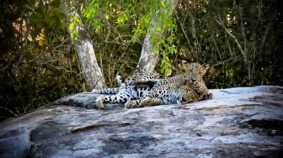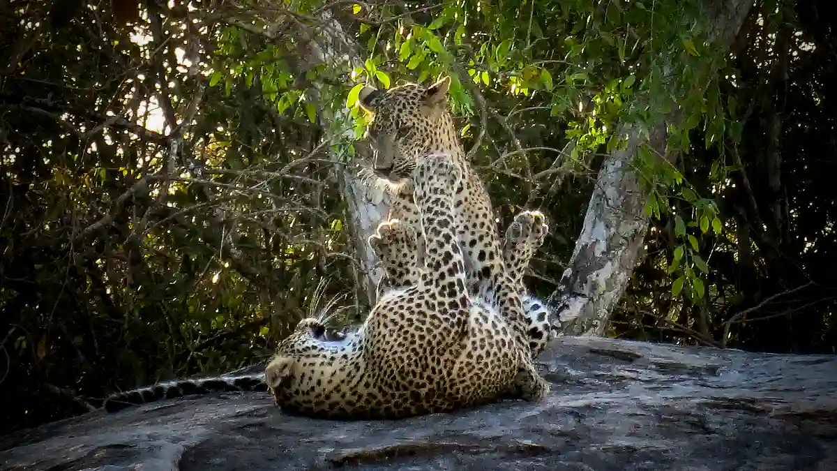 Vi hinner se några bufflar och en krokodil innan chaufförens/guidens radio sprakar till. Han snor runt bilen på stället och dundrar in på en annan väg. Och efter något hundratal meter tror vi inte våra ögon. Rakt framför oss, på kanske 10­–15 meters håll, ligger två leoparder och vilar.