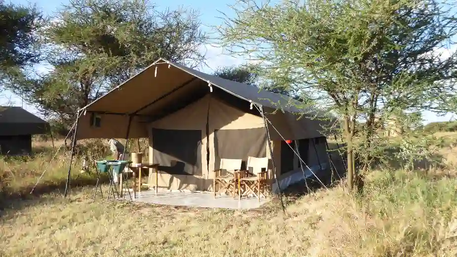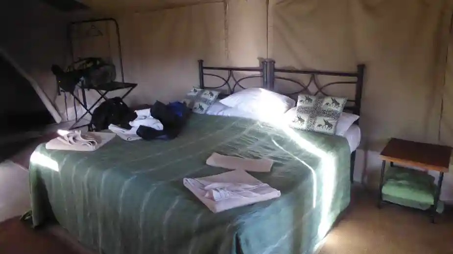 Sent på eftermiddagen kör vi in i Kati Kati Camp där vi ska sova två nätter. Den består av ett tiotal stora tält inredda med säng och sängbord, skrivbord och stolar och ett fullt utrustat badrum med dusch. För att få varmvatten ropar man ”hot water please!” och någon osynlig person hänger upp en säck med varmvatten på en ställning och kopplar på den på duschvattnet. Det funkar helt ok.