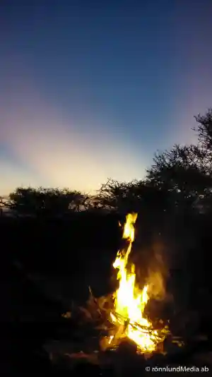 När man vill gå tillbaka till ”sitt” tält måste man ha guide med sig. Varför förstår man när man riktar ficklampan ut i mörkret runt campen. Då dyker ofta ett antal röda ögonpar upp och reflekterar ljuset. Hyenor som står och bevakar oss.