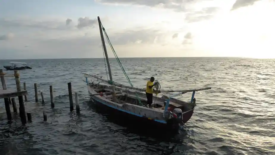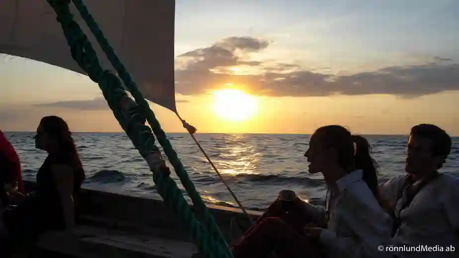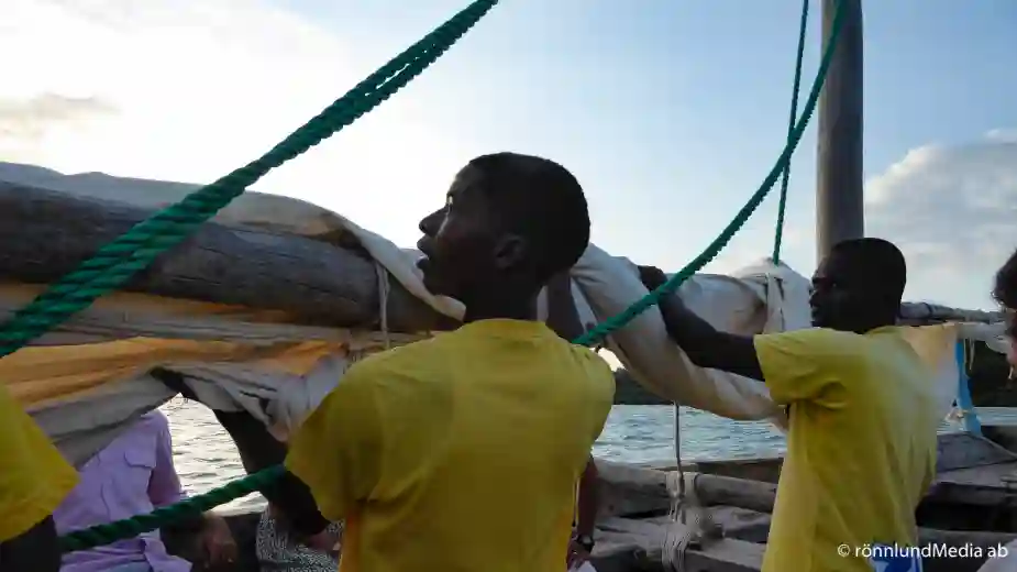 En till utfärd hinner vi med på Pemba. I skymningen, en halvtimme före solnedgången riggas en stor träsegelbåt, en dhow (du såg en segla förbi på förra sidan). Det är en arabisk båttyp som använts i dessa vatten i århundraden. Att sätta det enda stora trekantiga seglet är ett styvt jobb som kräver insatser av fyra besättningsmän. Men upp kommer det och sen glider vi så fint och stilla fram genom vattnet som färgas orangerött i solnedgången. Ett vackert sätt att ta farväl på, både till Pemba och till Afrika. Hoppas vi ses igen!