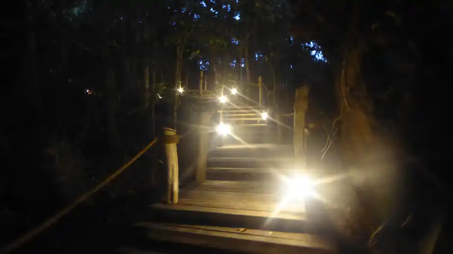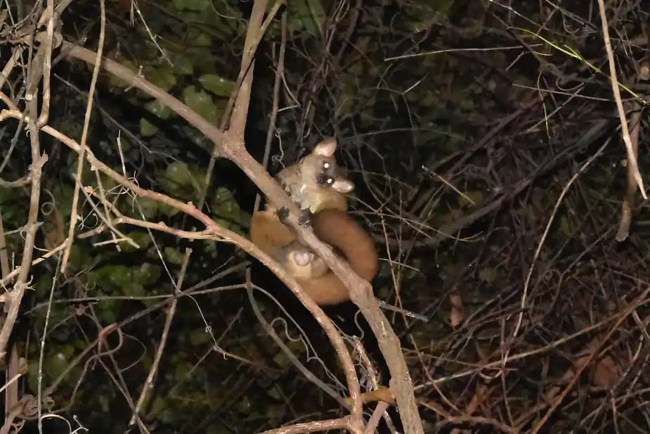 Vi tror att vi aldrig ska få se den men den allra sista kvällen när vi går hem efter middagen ser vi den plötsligt i ett träd bara fem-tio meter bort. Den ser ut som en stor ekorre med ett litet nallebjörnshuvud.