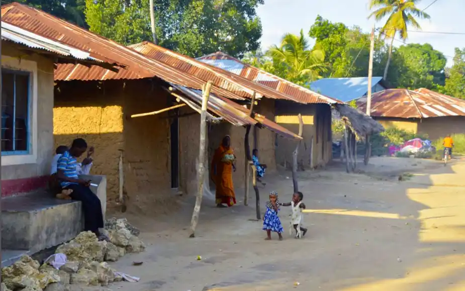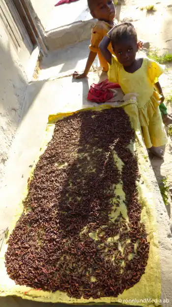 I övrigt är byns innevånare inte direkt påflugna utan håller sig för sig själva. Husen är för det mesta oerhört enkla lerhus, ”gatorna” är inte mer än dammiga stigar. Men överallt ligger tygstycken utbredda med små svarta växtdelar på. Det är kryddnejlikor som odlats på Zanzibar och Pemba i stor skala sedan många hundra år och här ligger nu den senaste skörden på tork.