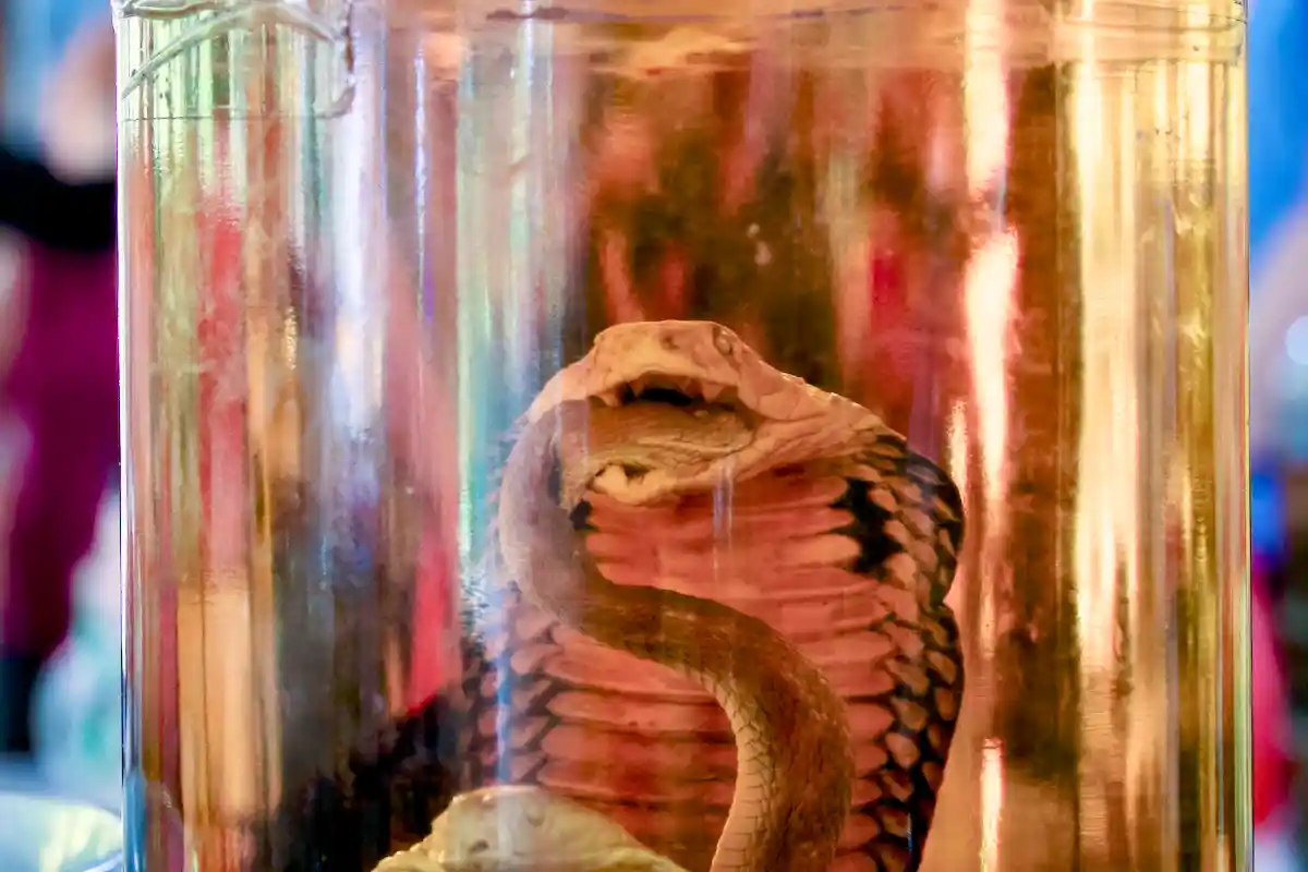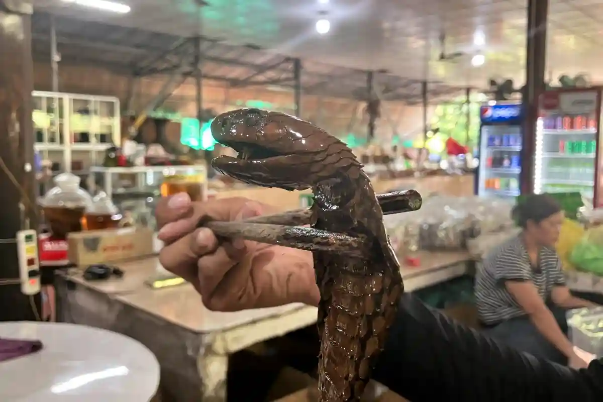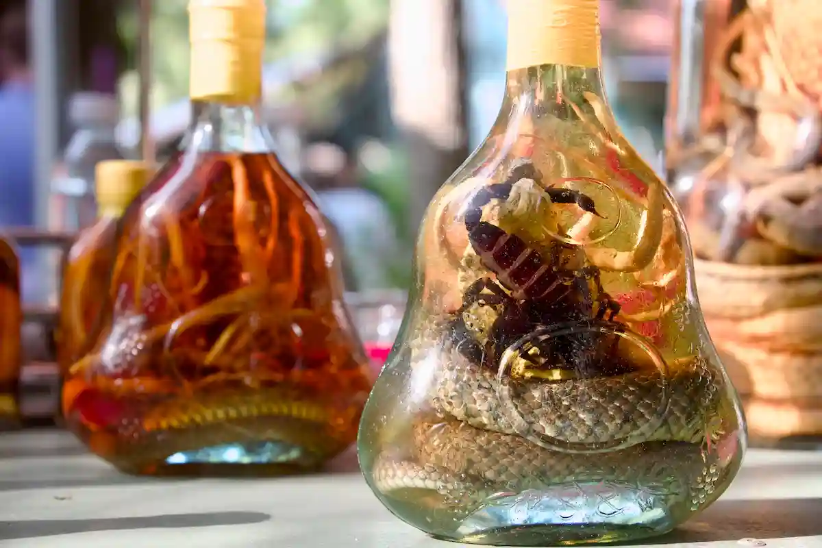 Besöket avslutas i en märklig butik som huvudsakligen torgför produkter av kokos. Det är allt från kokoskakor och kokosgodis till kokosglass och kokoschoklad. Men naturligtvis också väskor och t-tröjor och batikkläder. Bak i rummet tronar några stora glasflaskor med gulaktigt innehåll. Det visar sig vara risvin som buteljerats tillsammans med döda djur. Vi ser en liten kobra i en flaska och en skorpion i en annan. Traditionell kryddning, får vi veta, och vi provsmakar den med ormen. Det smakar risvin. Inget konstigt alls.