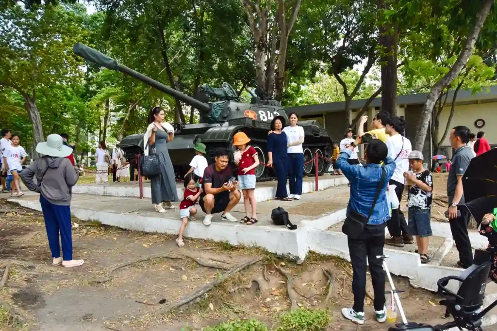 Två kvarter därifrån ligger Independence Palace, en ståtlig vit byggnad i klassisk stil som före återföreningen var säte för Sydvietnams regering. Det är nu ett museum med skyltar vid varje rum: ”Här sammanträdde si och så”, ”Här bodde ambassadör xxx”. Det är ohyggligt trångt, svettigt och måttligt intressant. Parken omkring palatset är däremot mycket vacker och här flanerar massor av folk. I ett hörn är en stridsvagn uppställd, den blir bakgrund i många selfies.